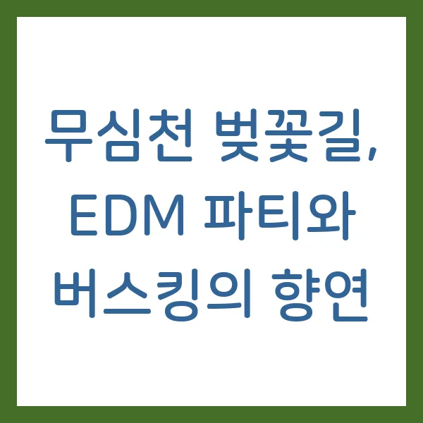 단순히 먹고 마시는 축제라고 생각하면 오산! 벚꽃길의 낭만을 더욱 풍성하게 만들어줄 다채로운 문화 콘텐츠도 준비되어 있습니다. 젊은 감각을 자극하는 신나는 EDM 파티는 축제의 열기를 한층 더 뜨겁게 만들어줄 겁니다. EDM의 흥겨운 비트에 맞춰 몸을 흔들다 보면 스트레스는 저 멀리 날아가 버릴 거예요! 또한, 감미로운 선율의 버스킹 공연은 벚꽃길의 낭만적인 분위기를 한층 더 고조시킬 예정입니다. 벚꽃 잎이 흩날리는 무심천변을 거닐며 아름다운 음악에 취해보는 건 어떨까요?