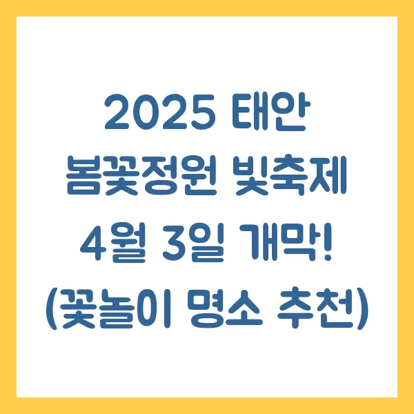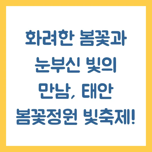 봄꽃 향기 가득한 태안으로 떠나볼까요? 4월 3일, 드디어 '2025 태안 봄꽃정원 빛축제' 가 막을 올립니다! 5천 평 규모의 네이처월드에서 펼쳐지는 이번 축제는 낮에는 화사한 봄꽃, 밤에는 황홀한 빛축제를 만끽할 수 있는 절호의 기회입니다. 태안 봄꽃정원, 빛축제, 꽃놀이, 축제, 태안 여행, 가족 여행, 데이트 코스 등 다채로운 키워드를 통해 봄의 향연을 미리 만나보세요!